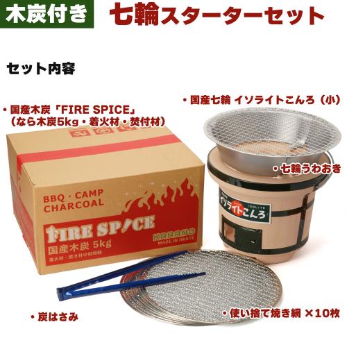 【しちりんセット】 国産七輪 スターターセット イソライトこんろ 国産なら木炭 着火材 焚付材 焼き網 炭ハサミ